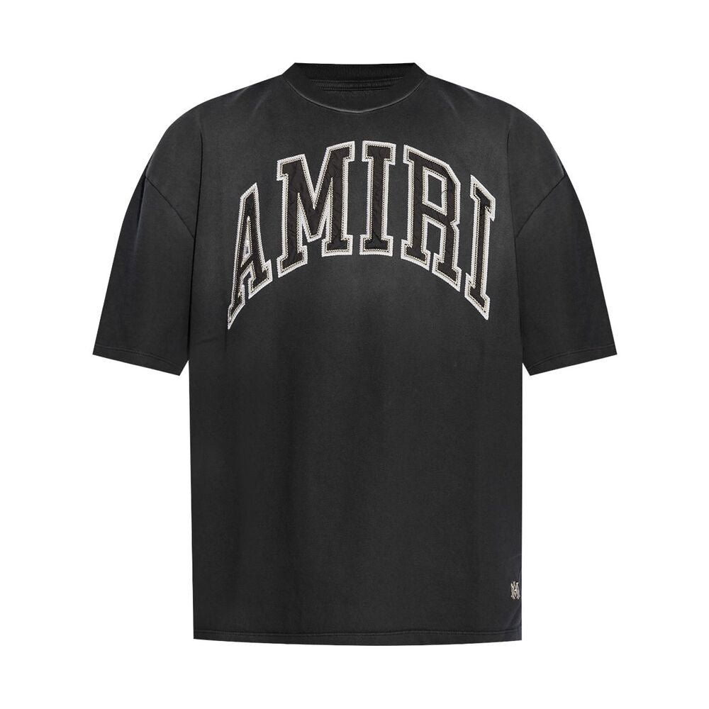 Black cotton jersey texture faded effect logo patch to the front ribbed band collar crew neck drop shoulder short sleeves straight hem.