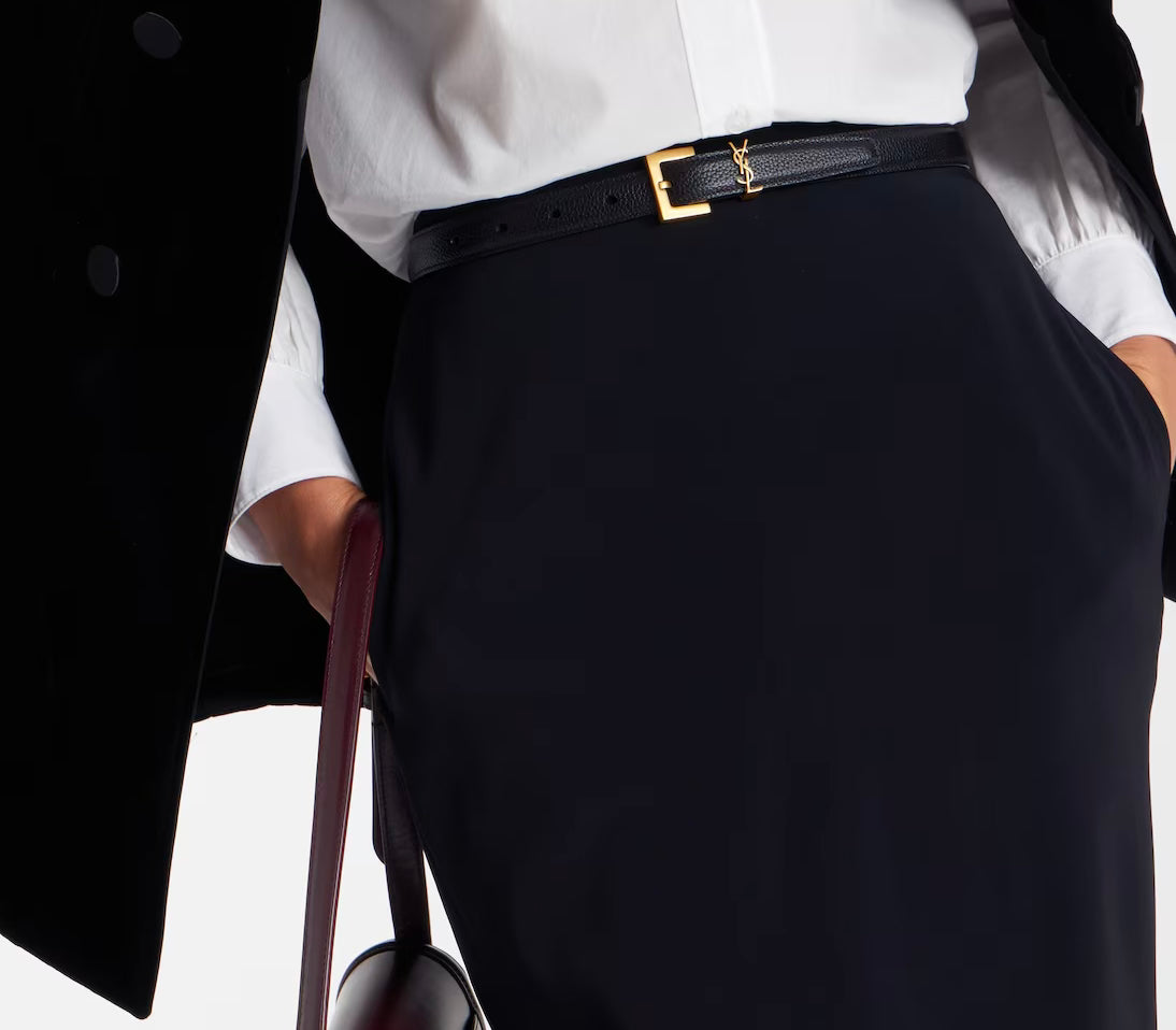 One of the most famous symbols in fashion, the YSL monogram consists of the intertwined initials of Saint Laurent's founder. Here in gold, it adorns the front of this slim belt, made in grained leather and finished with a gold-toned, squared buckle.